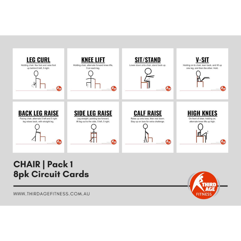 Elevate your older adult and seniors’ classes with our Chair Circuit Card Pack #1—the perfect resource for safe, effective, and accessible chair-based workouts! Each set contains eight large, color-laminated A4 cards, built to last and easy to wipe clean. Every card clearly demonstrates a key exercise using a chair, making it simple for instructors to create engaging circuits that accommodate all fitness levels.