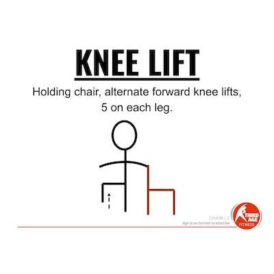 Chair circuit stations include: Leg Curls, Knee Lifts, Sit/Stand, V-Sit, Back Leg Raise, Side Leg Raise, Calf Raise, and High Knees.