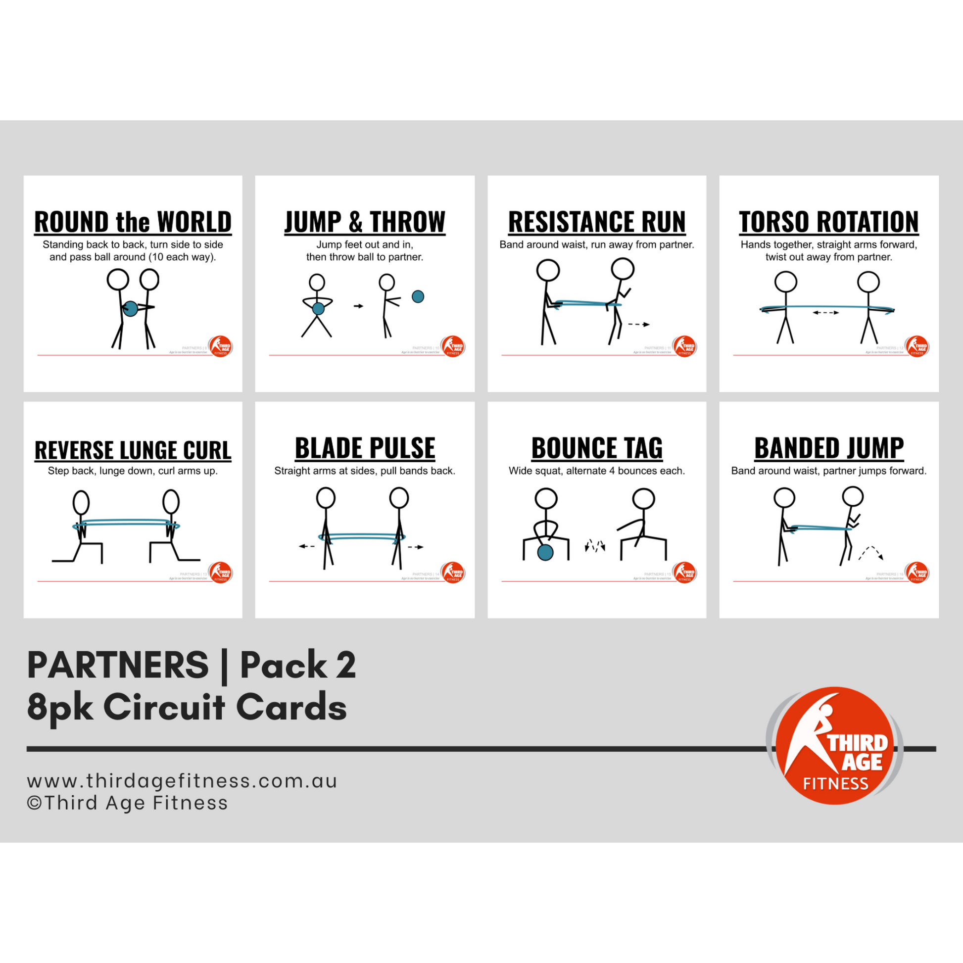 Enhance your older adult and seniors fitness classes with our Partners Circuit Card Pack #2! This vibrant set includes eight sturdy, colour-laminated A4 cards featuring partner exercises designed to build strength, coordination, and connection through shared movement.